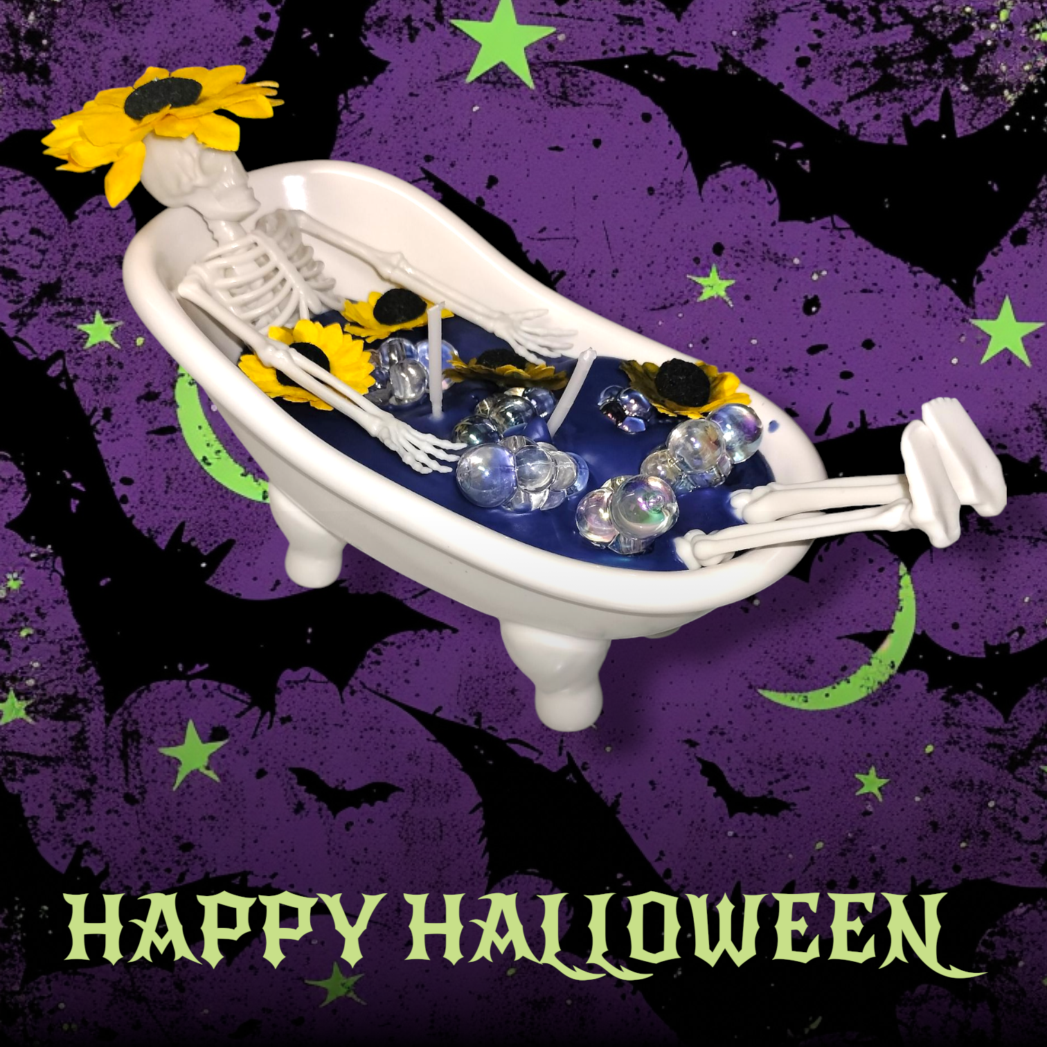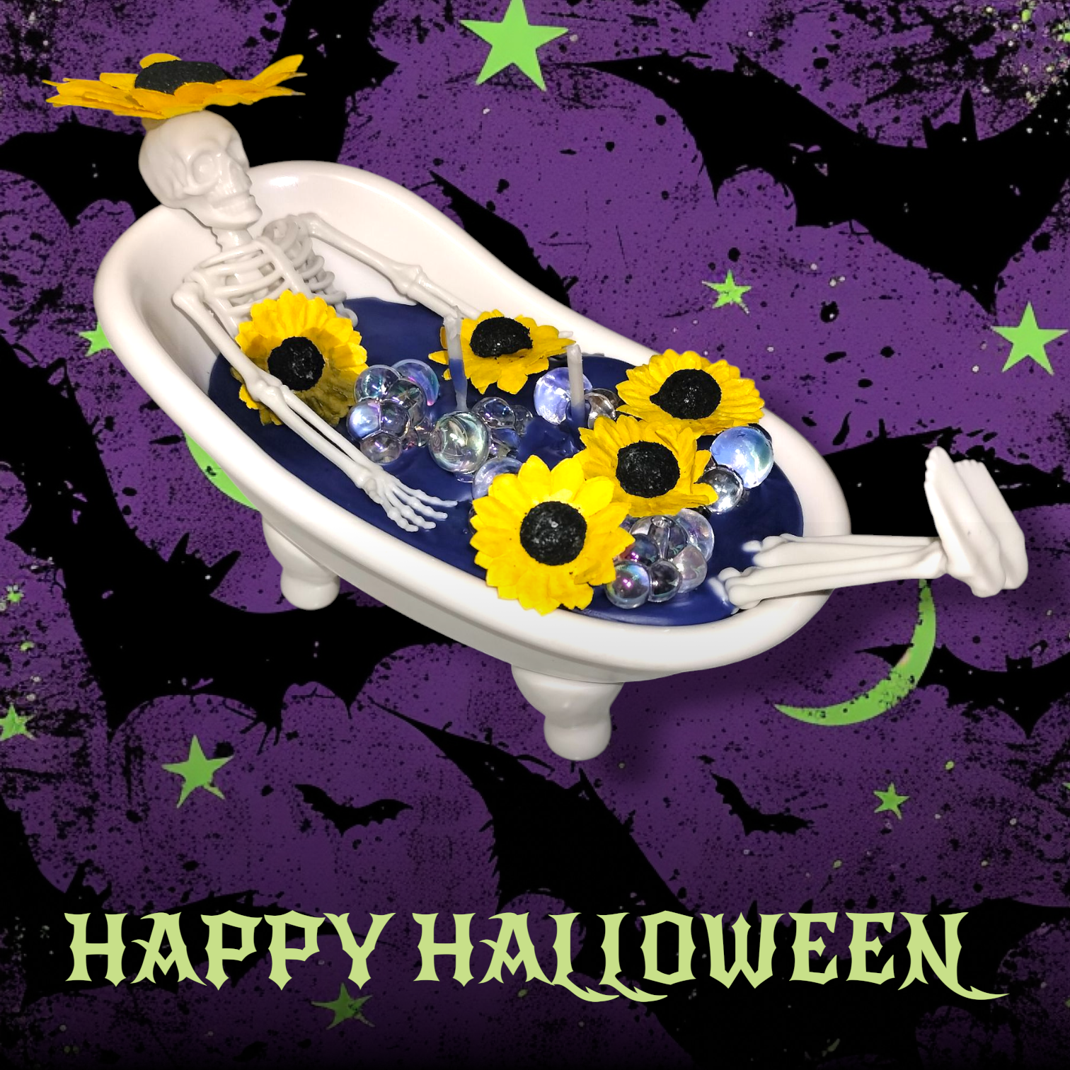 Expertly handcrafted, this Skelly Candle features a detailed skelly laying in a ceramic bathtub surrounded by sunflowers and bubbles. Infused with a soothing lavender scent, this candle provides a calming atmosphere perfect for relaxation or as a unique piece of decor. Made with high-quality materials, this candle is a must-have for any candle enthusiast.