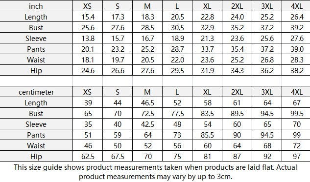 | Pant Length | 51.0 | 59.0 | 64.0 | 73.0 | 85.5 | 90.0 | 94.5 | 99.0 |