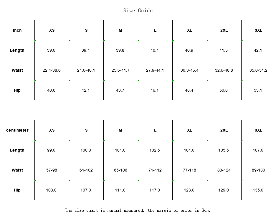 | Waist | 22.4-38.6 | 24.0-40.1 | 25.6-41.7 | 27.9-44.1 | 30.3-46.4 | 32.6-48.8 | 35.0-51.2 |