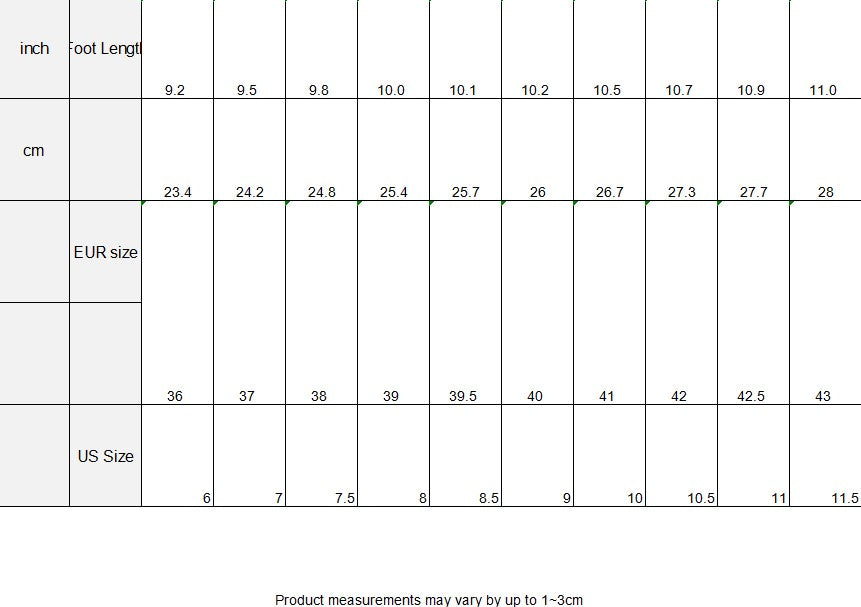 | EUR Size | US Size | Insole Length(inch) | Insole Length(mm) |